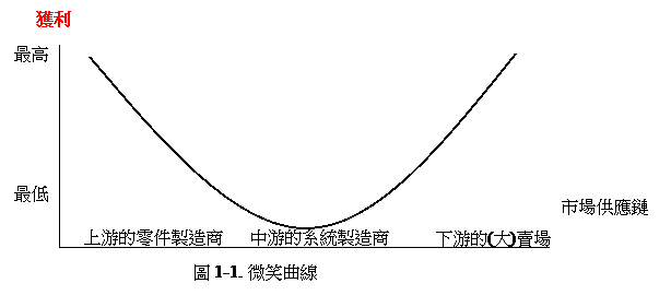 知名公司—宏碁創辦人,施振榮先生有一理論,稱為微笑曲線。其中說明在市場的供應鏈裡,位於中游的系統製造商獲利最低,而位於上游的零件製造商和下游的(大)賣場獲利最高。(見圖1 – 1 微笑曲綫)