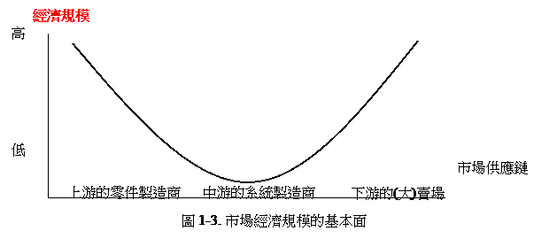 所以經濟規模的大小變成原有廠商的一種保護,而經濟規模也帶來高資金需求,能待在市場愈久的人,可以累積愈久的技術,而對新加入者形成一種進入障礙。高資金、高技術、大規模三個障礙在中游的成品製造商和中盤商較不存在;但對零件製造商與賣場有齊一性的特質的廠商,則會變成進入的大障礙。在這裡,經濟規模是關鍵,再來才是財務能力和管理能力。